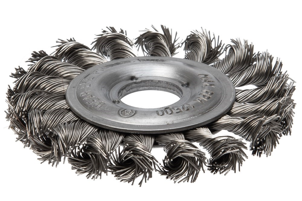 Дисковая щетка с нержавеющей проволокой предназначена для жестких очистных работ, идеальны для обработки сварных швов, окалины и ржавчины. Используется для профессионального, промышленного и индустриального применения. Щетки серии Эксперт подходят для использования на более высоких скоростях, соответственно интенсивность зачистных работ увеличивается более чем в 2 раза. Щетка высокого качества изготовления для применения с использованием УШМ (без резьбы). Тип проволоки по материалу изготовления – нержавеющая сталь. Диаметр проволоки 0,5 мм, ширина жгута 11 мм.