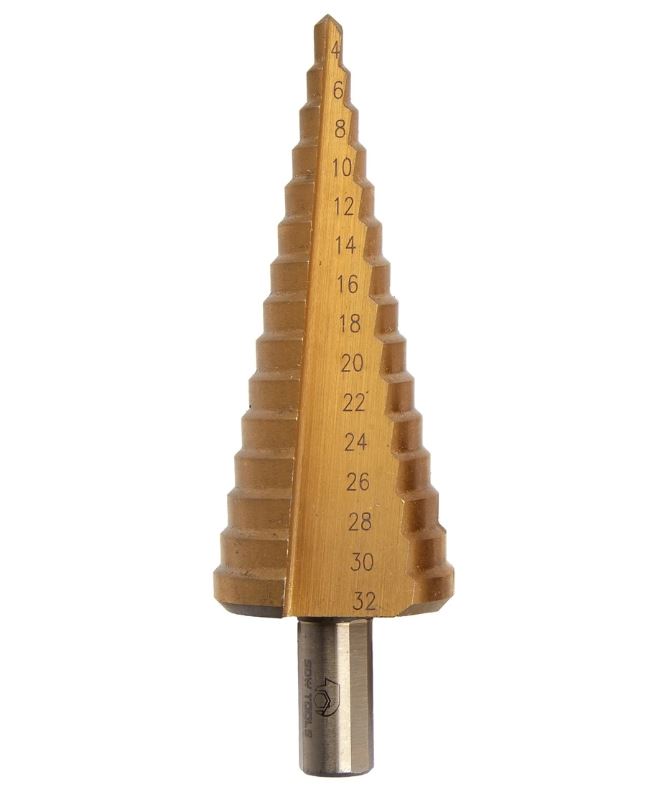 Сверло по металлу 4-32 мм ступенчатое цилиндрический хвостовик HSS TiN SDW TOOLS – цельное сверло из быстрорежущей стали для обработки различных материалов. Имеет конусовидную форму со ступенчатым переходом от меньшего диаметра к большему.