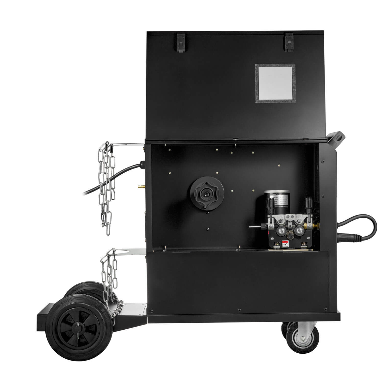 - Надежный металлический четырехроликовый механизм подачи проволоки обеспечивает стабильную подачу и позволяет устанавливать катушку весом до 15 кг. Контролировать расход проволоки помогает удобное боковое смотровое окно. В комплекте ролик 30х10х12 мм для стальной проволоки 0,8–1,0 мм.